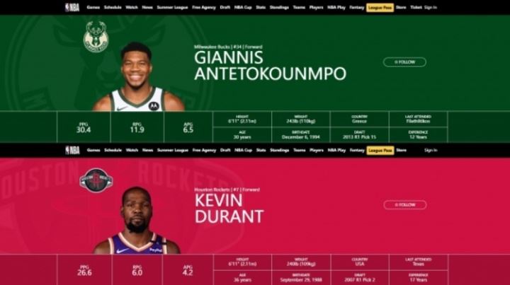 两人均是6‘11(210.82cm)杜兰特240LB(108.862kg)字母哥243LB(110.223kg)