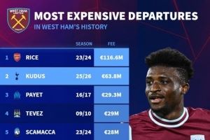 西汉姆出售球员转会费排名: