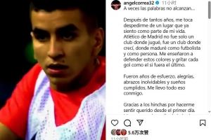 安赫尔-科雷亚写道:“有些心情难以言表,在历经这么多年后,我不得不向这个已成为生命一部分的地方道别。马竞不仅是我效力的俱乐部,更是我作为球员和男人成长的摇篮。在这里,我学会了为红白荣耀而战,懂得了每个进球都该像最后一球那样尽情呐喊。”